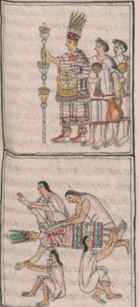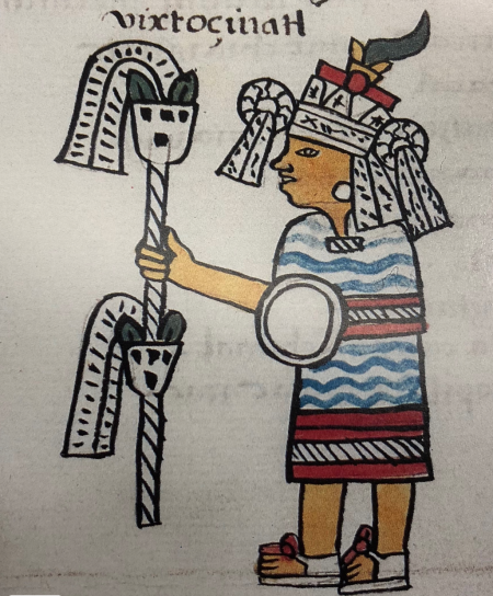 In the Florentine Codex, Sahagún expands upon his description of Huixtocihuatl, describing the appearance of the deity captured by the impersonator. Sahagun likens Her face paint, costume, and feathers to a maize plant at antithesis. He says,