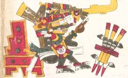 One popular creation myth variant involves four Teteo known as the Four Tezcatlipocas. Each of them, an important and influential Teotl in Their own right, represents a different Direction: Quetzalcoatl as the White Tezcatlipoca of the West, Xipe Totec as the Red Tezcatlipoca of the East, Huitzilopochtli as the Blue Tezcatlipoca of the South, and regular Tezcatlipoca as the Black Tezcatlipoca of the North.